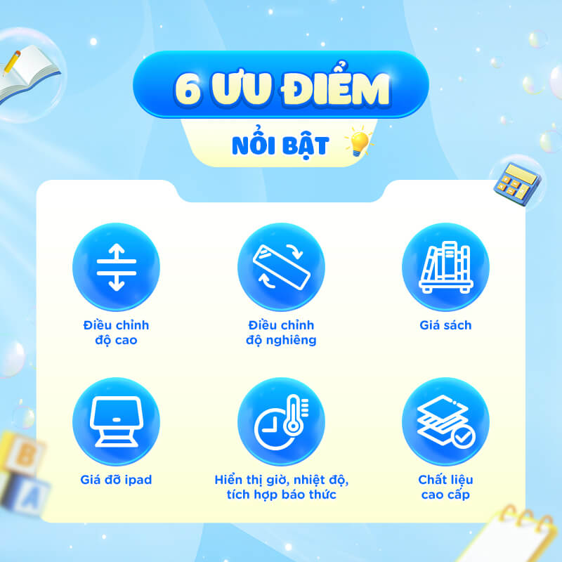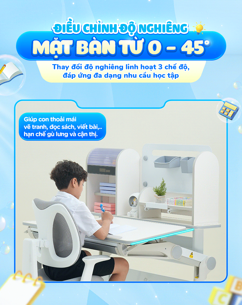 - Điều chỉnh mặt bàn nghiêng 3 chế độ từ 0°- 45°, đáp ứng nhiều nhu cầu học tập
