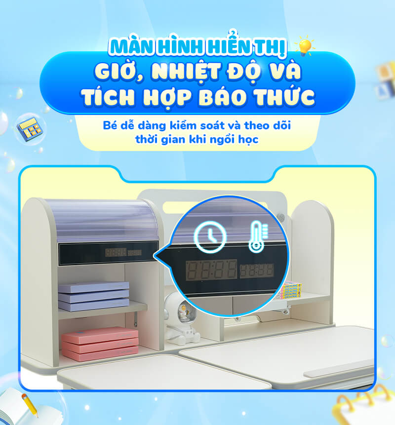 - Màn hình hiển thị giờ, nhiệt độ, tích hợp báo thức