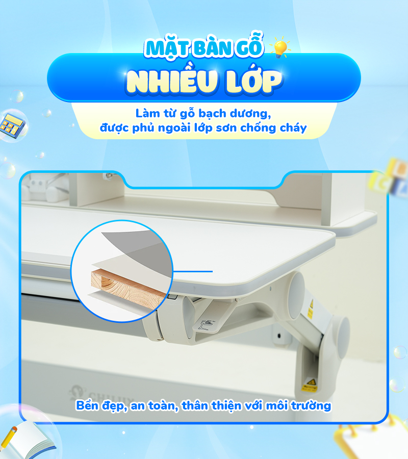- Chất liệu mặt bàn: gỗ bạch dương nhiều lớp, phủ ngoài lớp sơn chống cháy