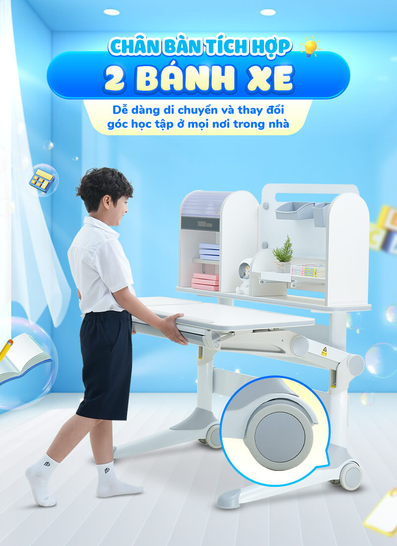 - Chân bàn tích hợp 2 bánh xe di chuyển mọi nơi trong nhà