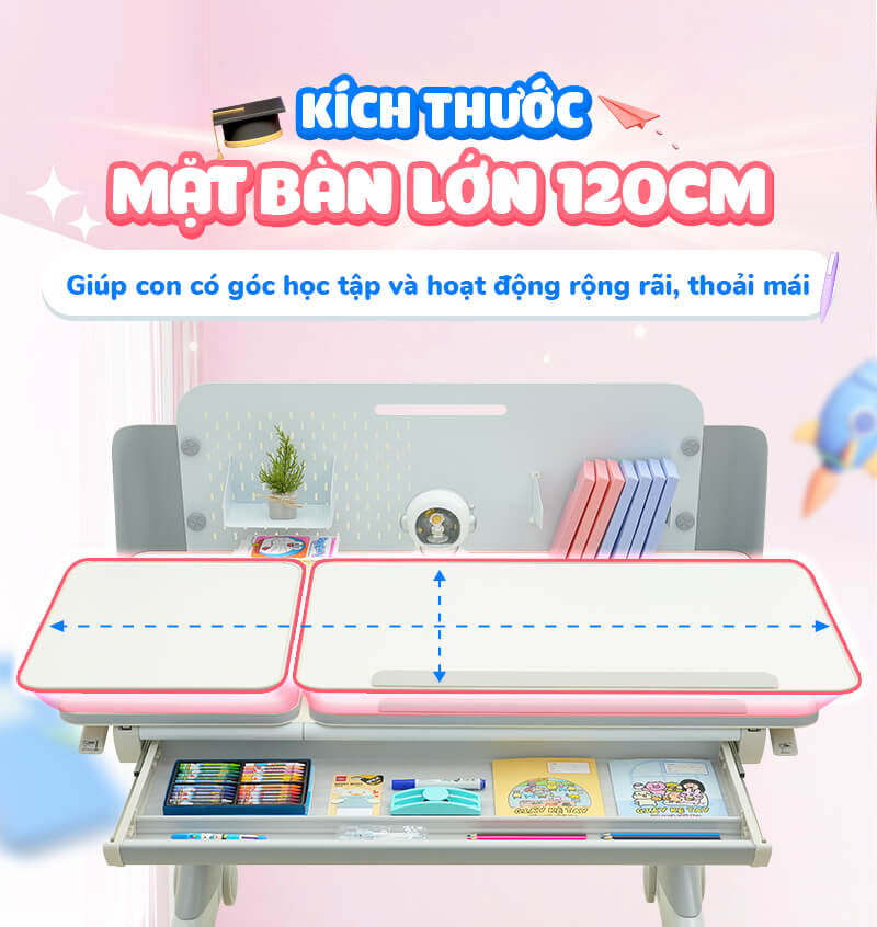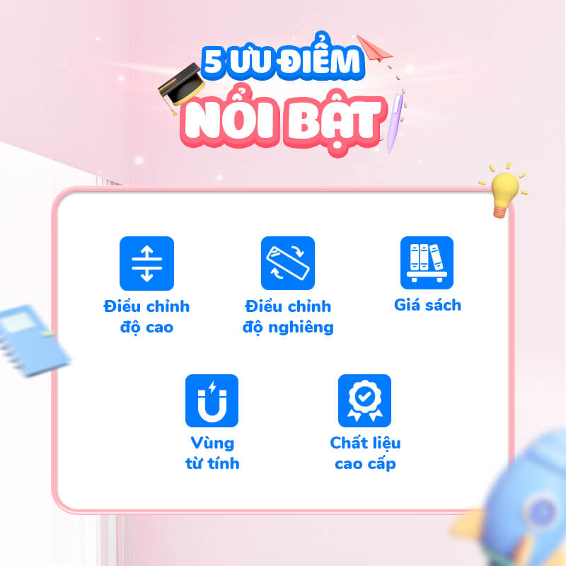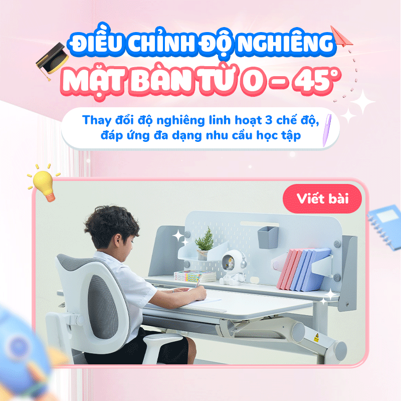 - Điều chỉnh mặt bàn nghiêng 3 chế độ từ 0°- 45°, đáp ứng nhiều nhu cầu học tập