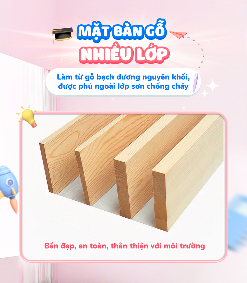 - Chất liệu mặt bàn: gỗ bạch dương nhiều lớp, phủ ngoài lớp sơn chống cháy
