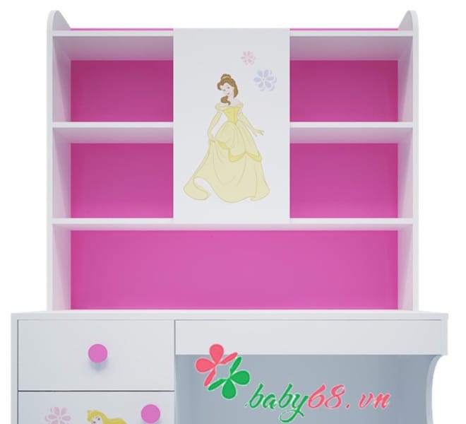 Bàn được chia thành nhiều tầng kệ và 2 ngăn tủ để bé sắp xếp sách vở, vật dụng của mình một cách khoa học, hợp lý. Bên cạnh bức tranh nàng công chúa duyên dáng, bé cũng có thể bài trí những món đồ trang trí xinh đẹp để góc học tập thêm sinh động và tươi mới, từ đó bé sẽ cảm thấy hứng thú hơn khi học.