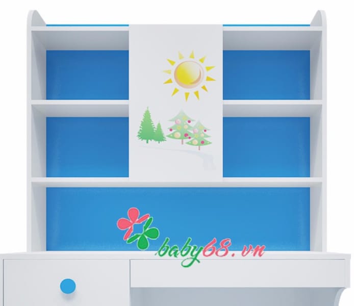 Bàn được chia thành nhiều tầng kệ và 2 ngăn tủ để bé sắp xếp sách vở của mình một cách khoa học, hợp lý. Bên cạnh bức tranh phong cảnh sẵn có, bé cũng có thể bài trí những món đồ trang trí xinh đẹp để góc học tập thêm sinh động và tươi mới, từ đó bé sẽ cảm thấy hứng thú hơn khi học.