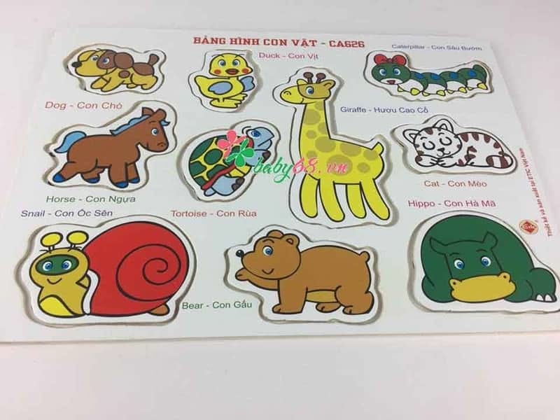 Bảng hình con vật – CA626 gồm các miếng ghép bằng gỗ khác nhau, các bé sẽ cố gắng tìm đúng vị trí và ghép thành bức tranh hoàn chỉnh bảng hình con vật ngộ nghĩnh. Trên mỗi miếng ghép tương ứng là những chữ cái qua đó bé cũng có thể làm quen dần với những hình ảnh các con vật ngay từ khi còn nhỏ.