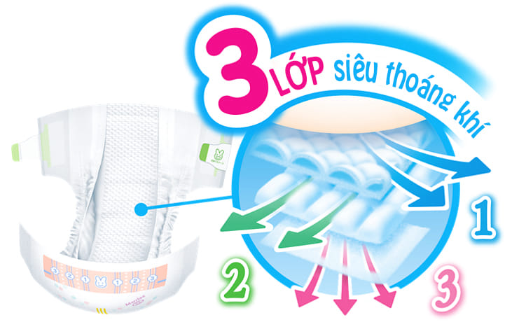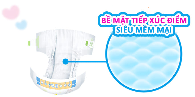– Thoát khí giữa tã và da bé nhờ bề mặt tiếp xúc điểm xốp mịn;