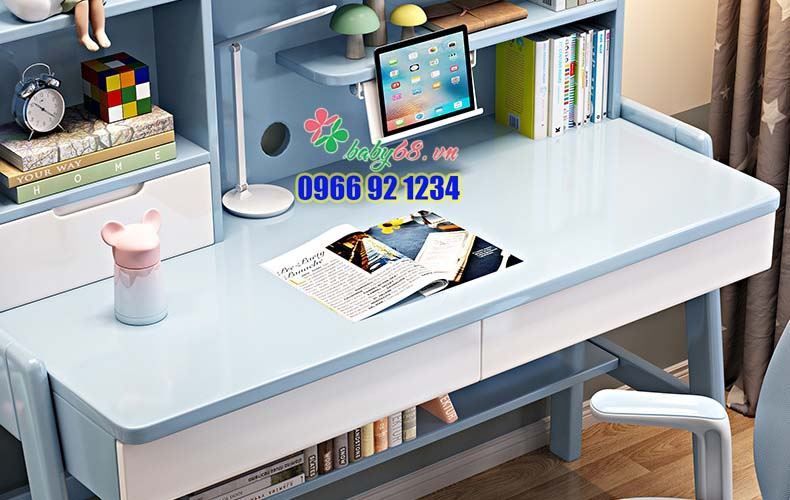 ✔️ Chất liệu mặt bàn làm từ gỗ cao cấp, phủ một lớp chống phản chiếu ánh sáng. Sẽ giúp bé ngồi học lâu không có hiện tượng loá mắt, chống cận thị hiệu quả