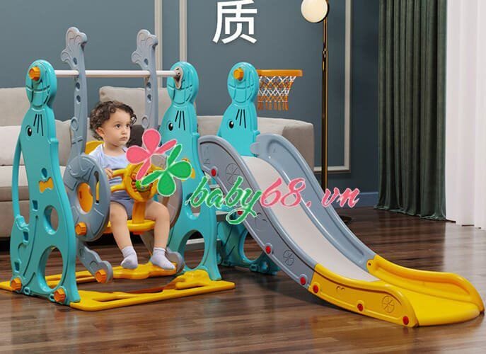 Sử dụng chất liệu nhựa nguyên khối cao cấp, tích hợp nhiều trò chơi như cầu trượt, xích đu và bóng rổ, giúp bé có thể luân phiên thay đổi các trò chơi tùy theo sở thích.