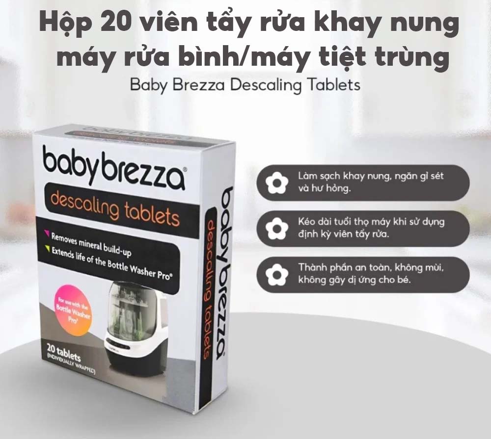 - Để các máy Baby Brezza hoạt động bền bỉ và an toàn, mẹ nên vệ sinh định kỳ với viên tẩy rửa chuyên dụng.