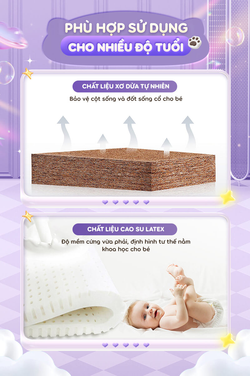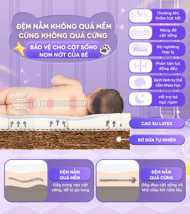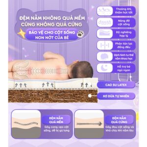 - Ruột là nệm latex và xơ dừa bảo vệ cột sống và đốt sống