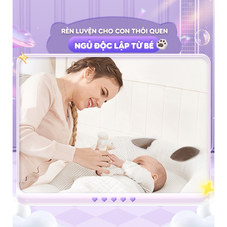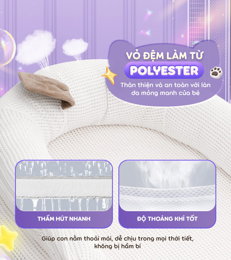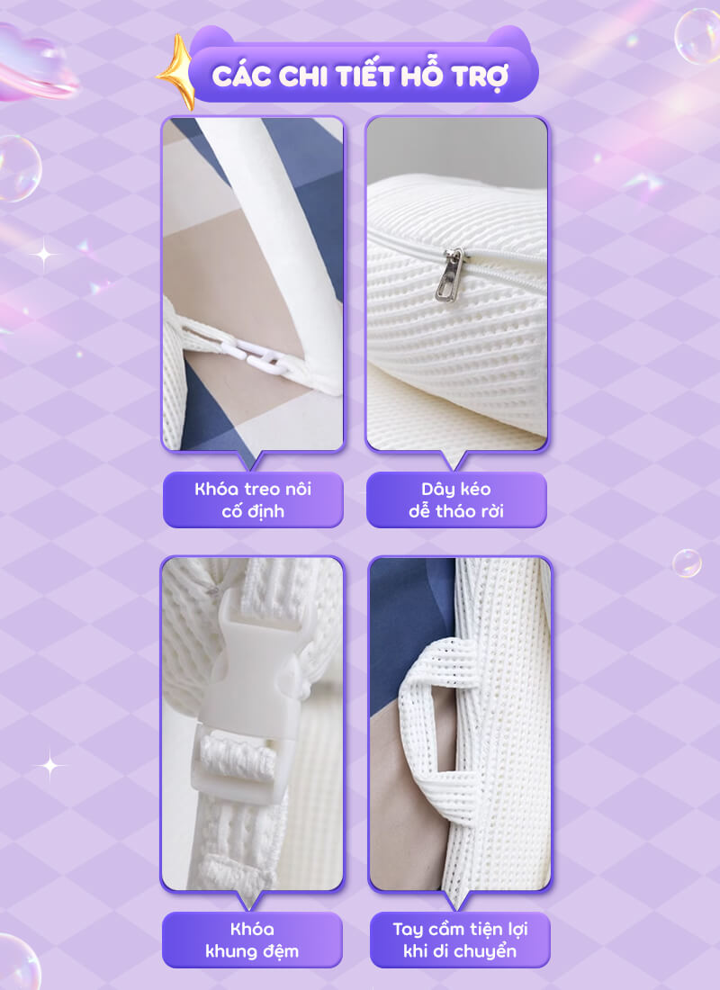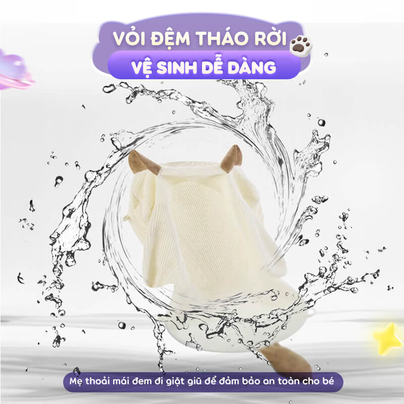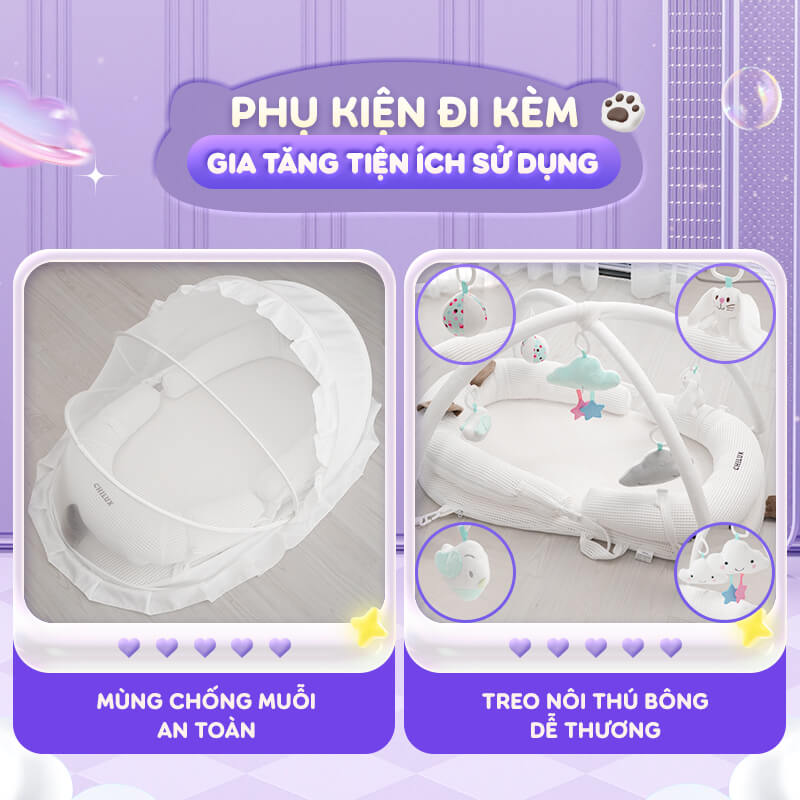 - Bộ sản phẩm bao gồm: Đệm nằm, mùng chống muỗi, thanh treo nôi thú bông