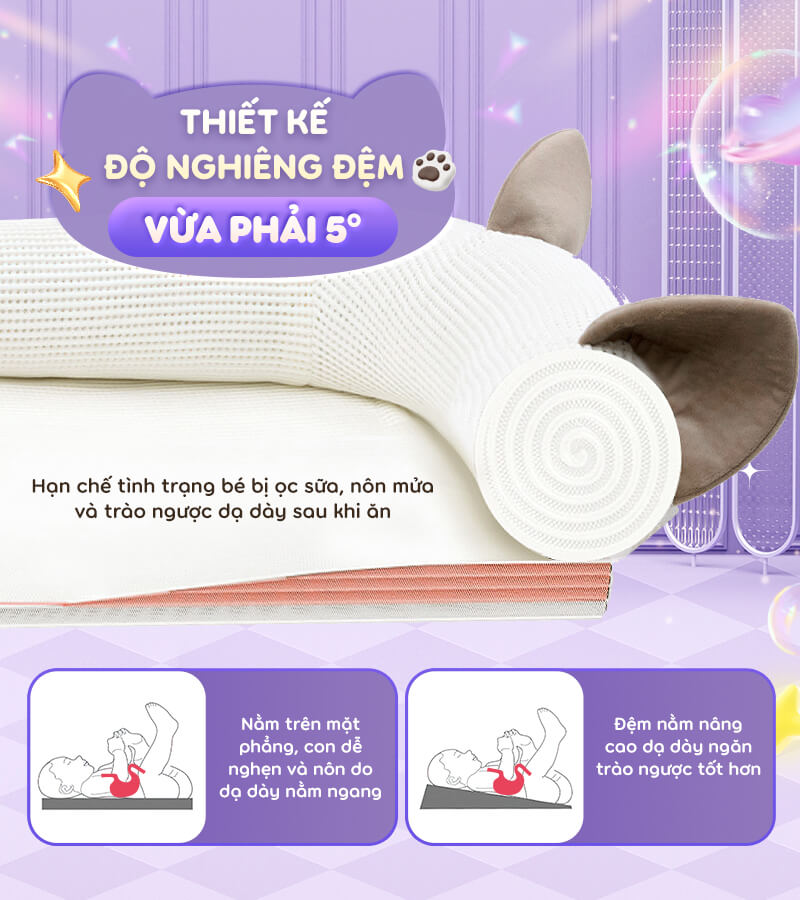 - Độ nghiêng đệm 5°vừa phải hạn chế tình trạng ọc sữa, nôn mửa hay trào ngược dạ dày
