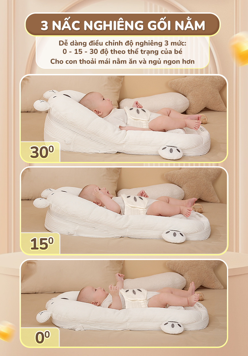 ✅Tránh nôn trớ sau khi ăn: với thiết kế phần đầu gối cao và độ nghiêng có thể điều chỉnh 3 mức 0-30°, giúp định hình tư thế nằm của bé phù hợp với vị trí và cấu tạo hệ tiêu hoá, hạn chế nôn trớ thức ăn và ọc sữa.