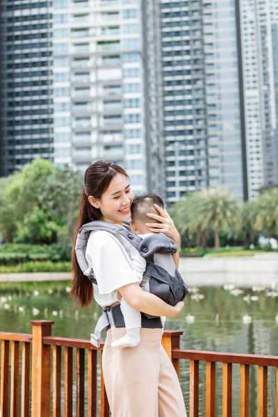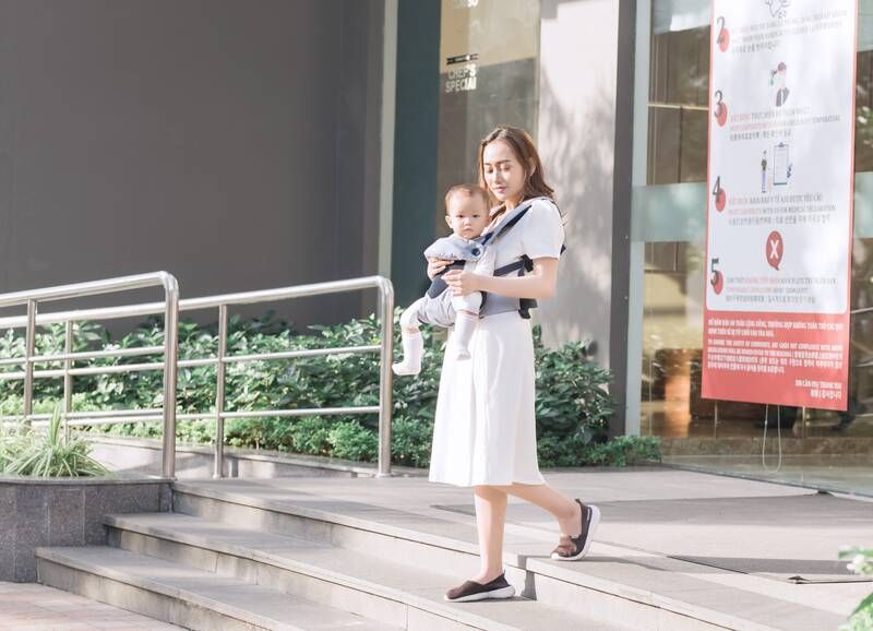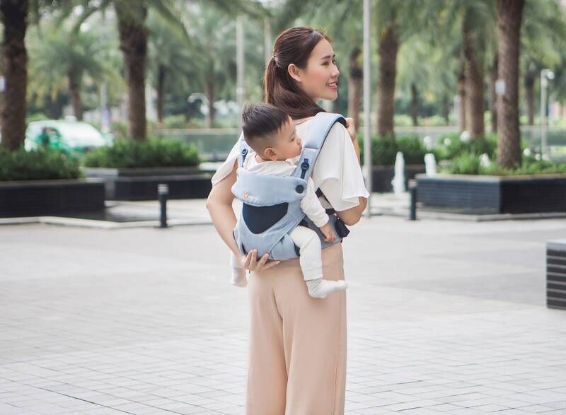 Mẹ có thể địu bé với tư thế quay mặt ra trước để bé có thể khám phá thế giới bên ngoài
