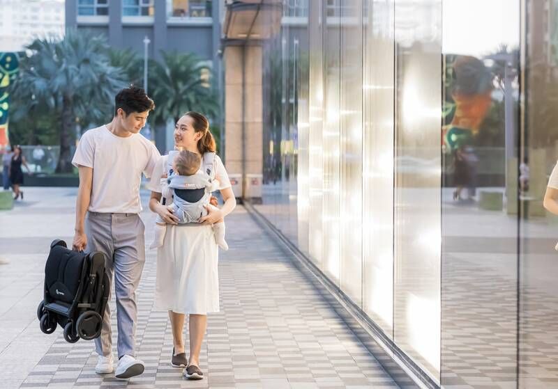 Địu Ergobaby giúp bố mẹ có thể địu bé đi chơi mà không cần phải bồng bế bé
