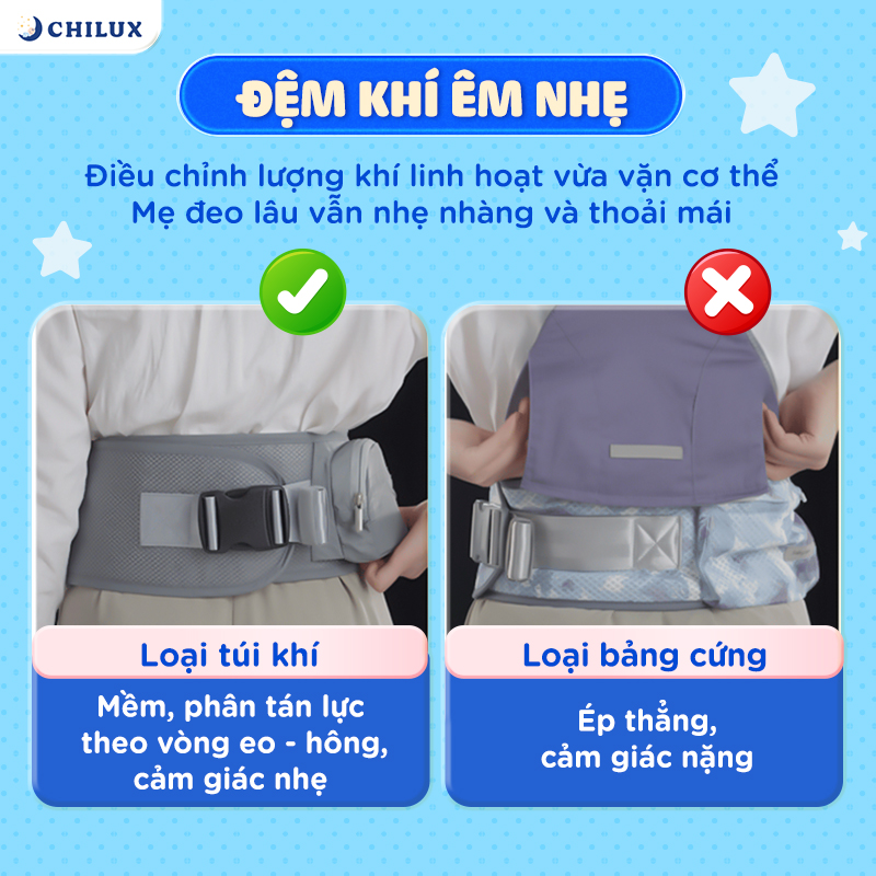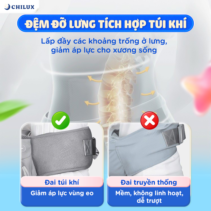 - Đệm đỡ lưng túi khí, giảm áp lực vùng eo cho ba mẹ