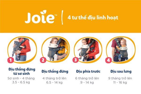 - Địu thẳng đứng thích hợp sử dụng cho bé từ 4 tháng trở lên (6,5 – 14kg).