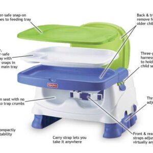 Ghế ăn Fisher Price P0109 khá nhẹ, phần khay ăn có thể tháo rời để cọ rửa, loại ghế nhựa thấp thường được thiết kế để có thể kết hợp với các loại ghế cao hơn khi gia đình dùng bàn ăn và muốn con ăn cùng bữa. Vì nhẹ nên loại ghế này tiện dụng khi bố mẹ muốn mang theo con khi đi xa.