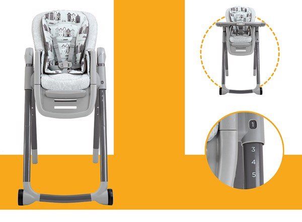 – 5 mức điều chỉnh độ cao ghế để phù hợp với chiều cao của bàn ăn trong từng gia đình hoặc độ cao mà mẹ mong muốn.
