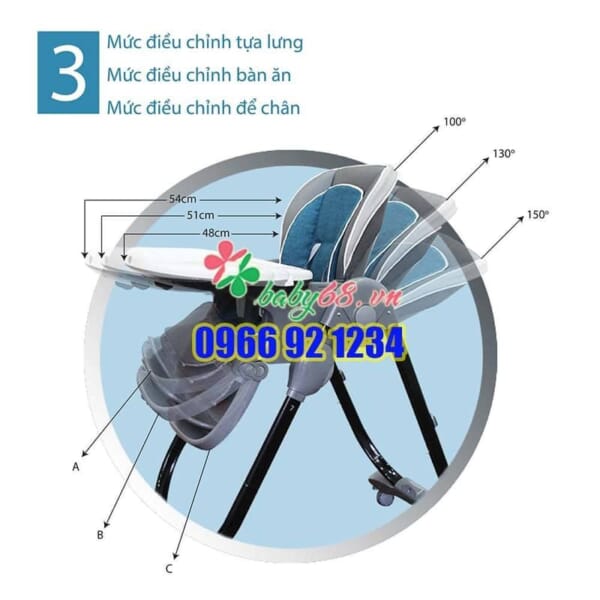 Thiết kế 3 vị trí ngả, ghế phù hợp với các tư thế ăn của trẻ: nằm uống sữa, nghiêng ăn bột, ngồi ăn dặm hoặc ngồi chơi