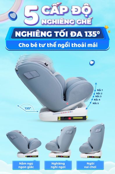 – 5 cấp độ nghiêng ghế: nghiêng tối đa 145 độ cho bé tư thế ngồi thoải mái
