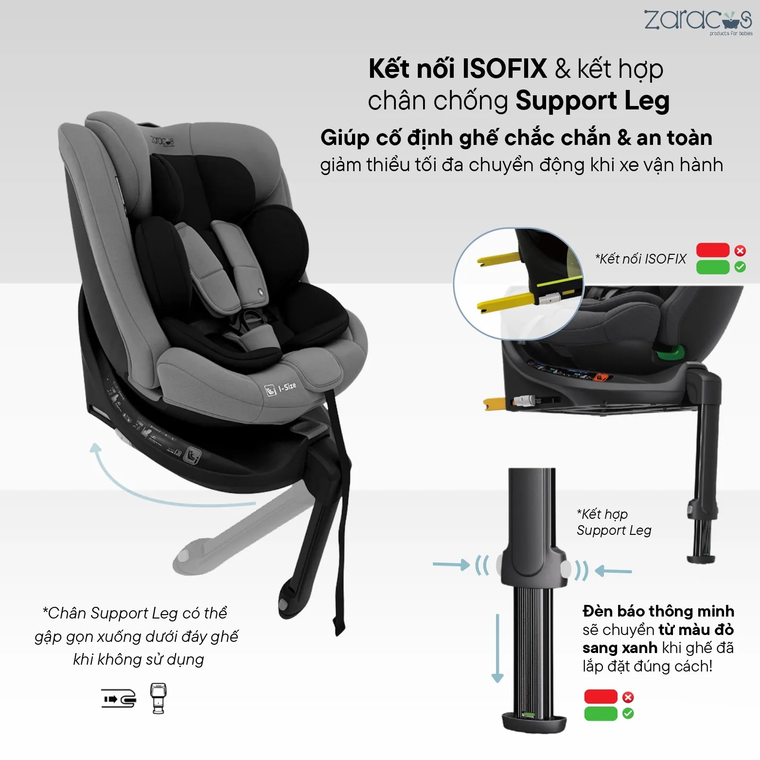 - Kết nối chắc chắn bằng Isofix + chân chống Support Leg, đảm bảo ổn định tối đa.