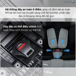 Dây đai có thể điều chỉnh linh hoạt theo kích thước cơ thể trẻ, giúp bé luôn ngồi đúng tư thế và thoải mái ở mọi giai đoạn phát triển. Khi bé lớn hơn và chuyển sang chế độ booster, phần dây đai có khoang riêng để cất gọn, giữ cho ghế luôn gọn gàng, thẩm mỹ và tạo không gian ngồi rộng rãi hơn cho trẻ.
