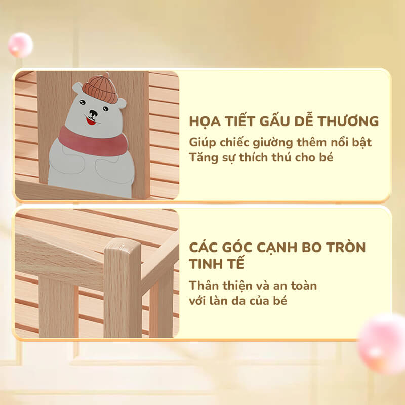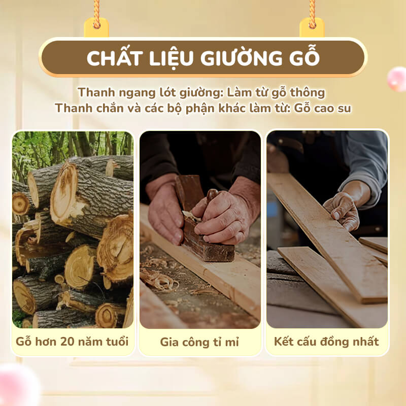 Chất liệu giường: Thanh ngang lót giường làm từ gỗ thông, Thanh chắn và các bộ phận khác làm từ gỗ cao su