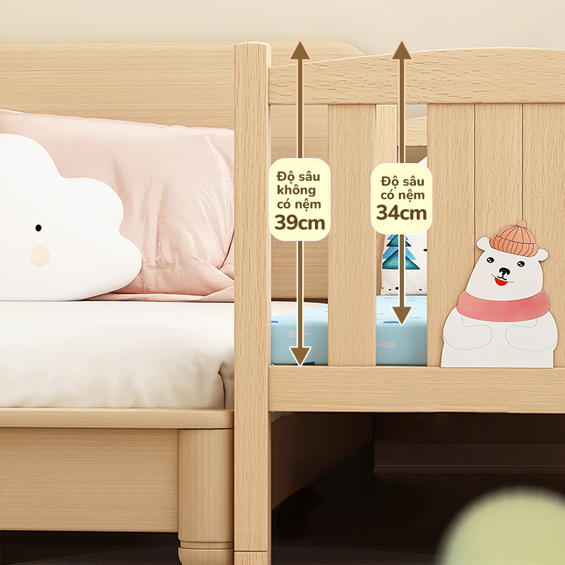 ✔️Thiết kế thành nôi 3 mặt, độ sâu 40cm và các góc cạnh được bo tròn tỉ mỉ, giữ bé luôn an toàn khi nằm trong giường