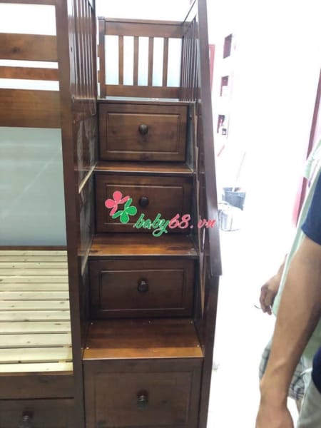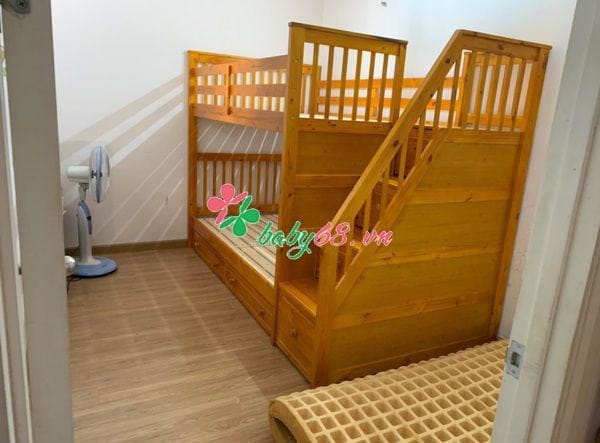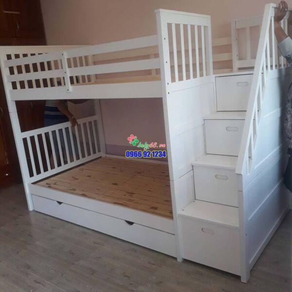 Chiếc giường có kết cấu 2 tầng chắc chắn, làm từ chất liệu gỗ tự nhiên cao cấp, bậc thềm đi lên thiết kế dạng khối hộp kết hợp ngăn đựng đồ tiện ích cho gia đình.
