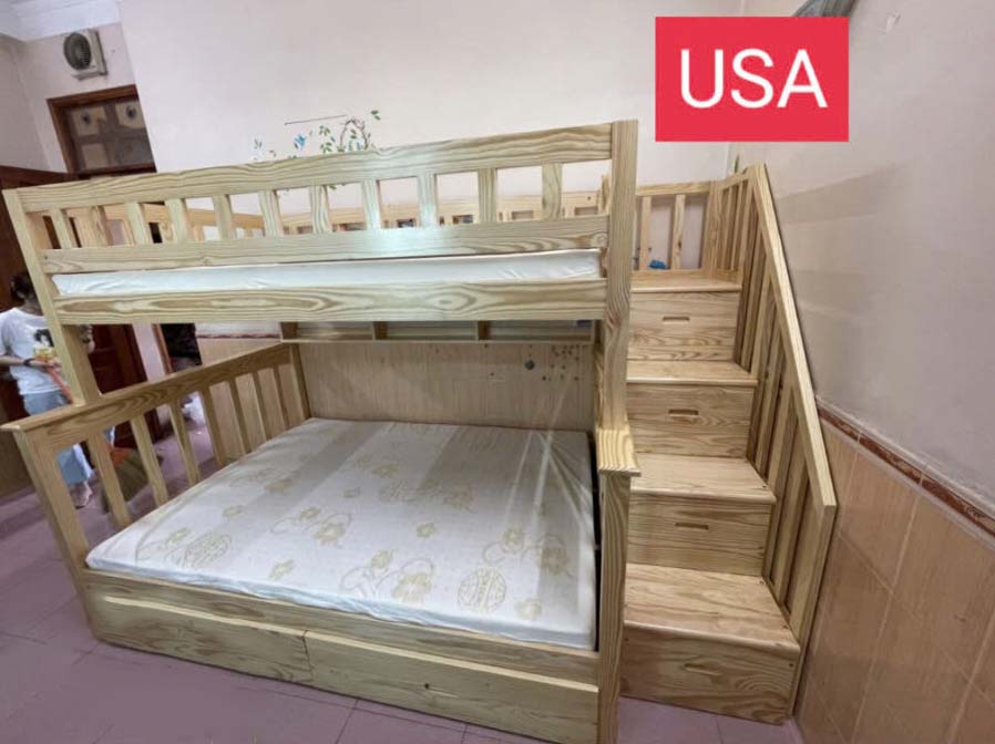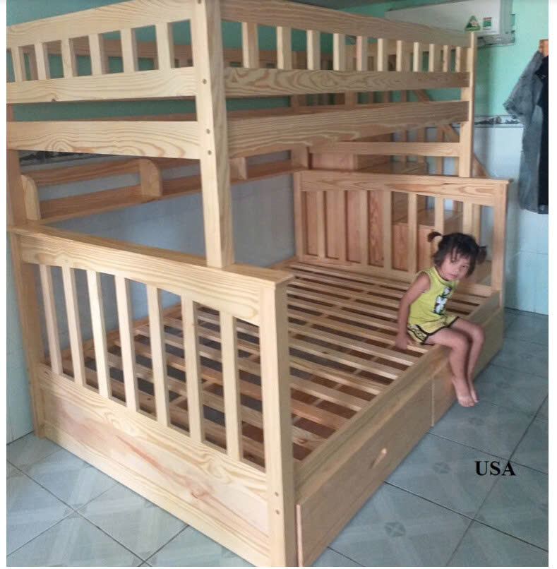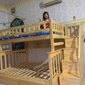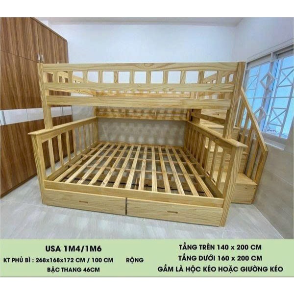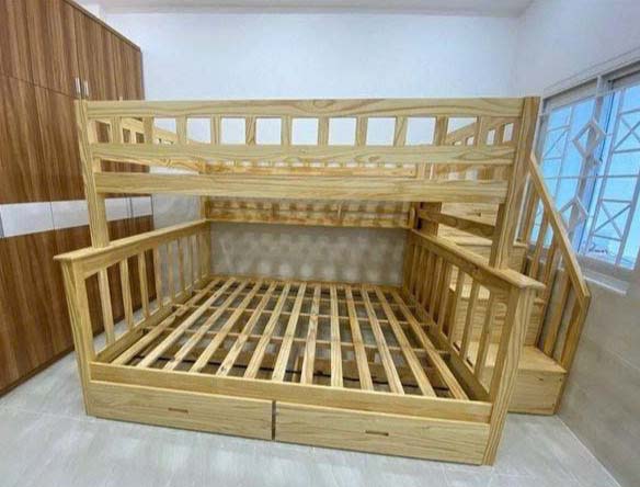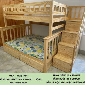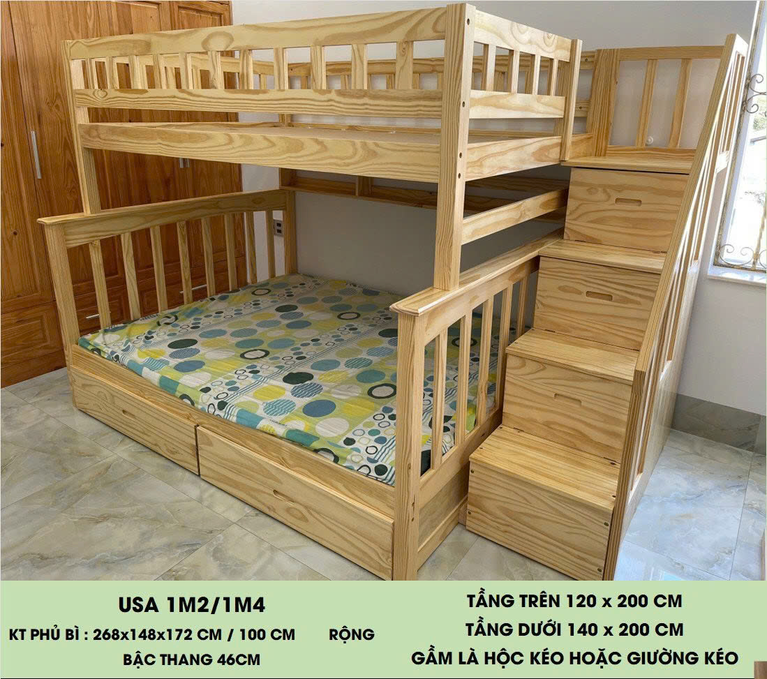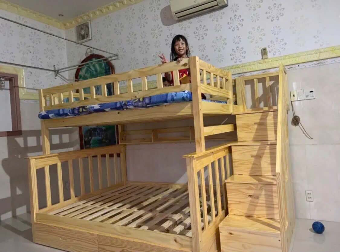 – Dùng được cho cả trẻ em và người lớn với 2 giường nằm, trong đó tầng dưới cùng có thể thiết kế làm giường hoặc ngăn tủ để đồ, 3 hộc tủ ở cầu thang, có thể để được nhiều quần áo, chăn đệm rất tiện lợi. Ngoài ra, giường tầng còn kết hợp giá sách giúp tiết kiệm diện tích và rất tiện lợi.