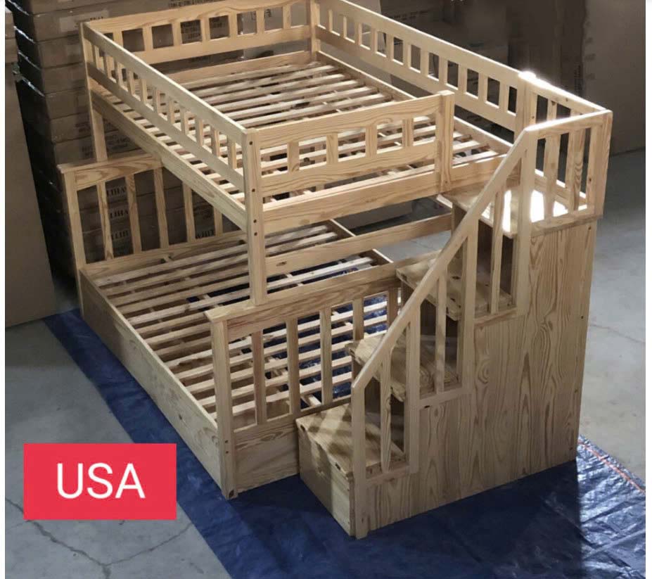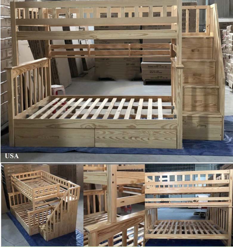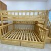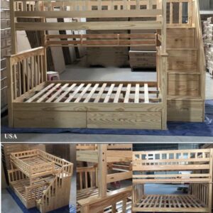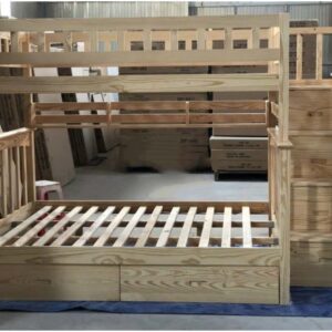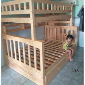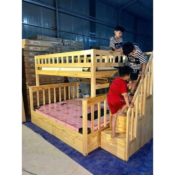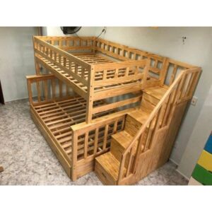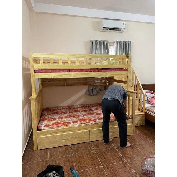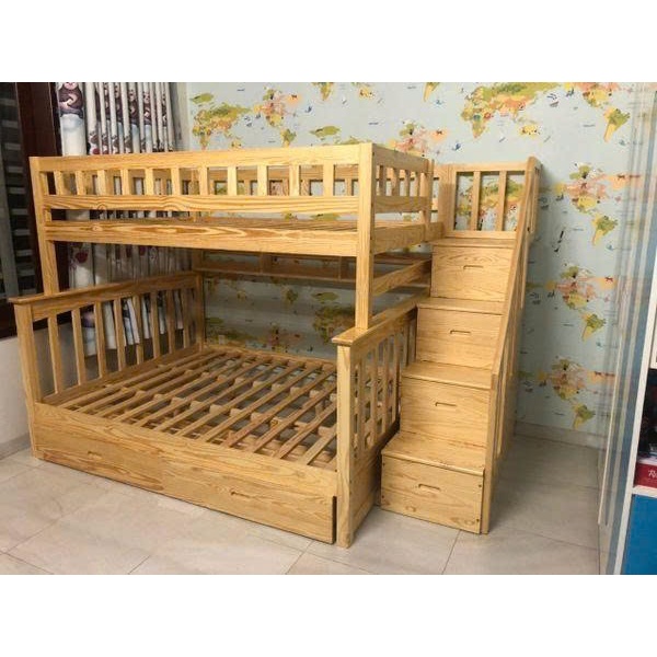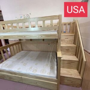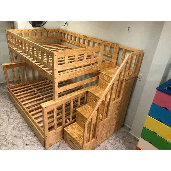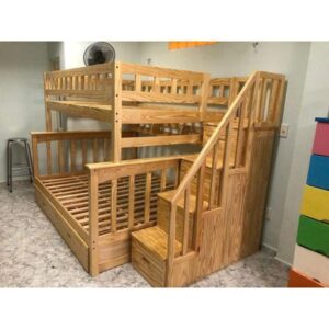 – Dùng được cho cả trẻ em và người lớn với 2 giường nằm, trong đó tầng dưới cùng có thể thiết kế làm giường hoặc ngăn tủ để đồ, 3 hộc tủ ở cầu thang, có thể để được nhiều quần áo, chăn đệm rất tiện lợi. Ngoài ra, giường tầng còn kết hợp giá sách giúp tiết kiệm diện tích và rất tiện lợi.