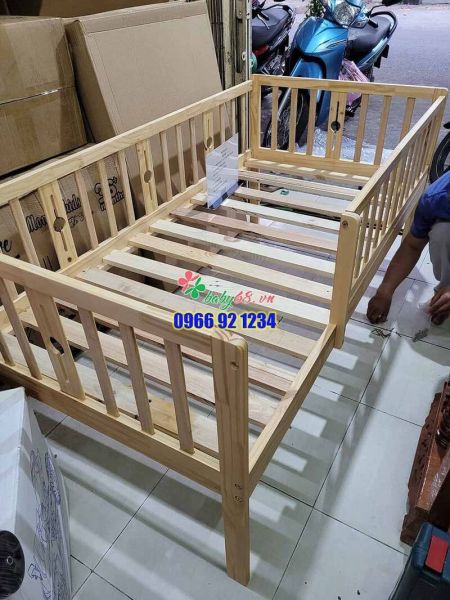 – Giường gỗ ghép cho bé với bố mẹ với thiết kế thành giường cao an toàn khi bé nằm ngủ.