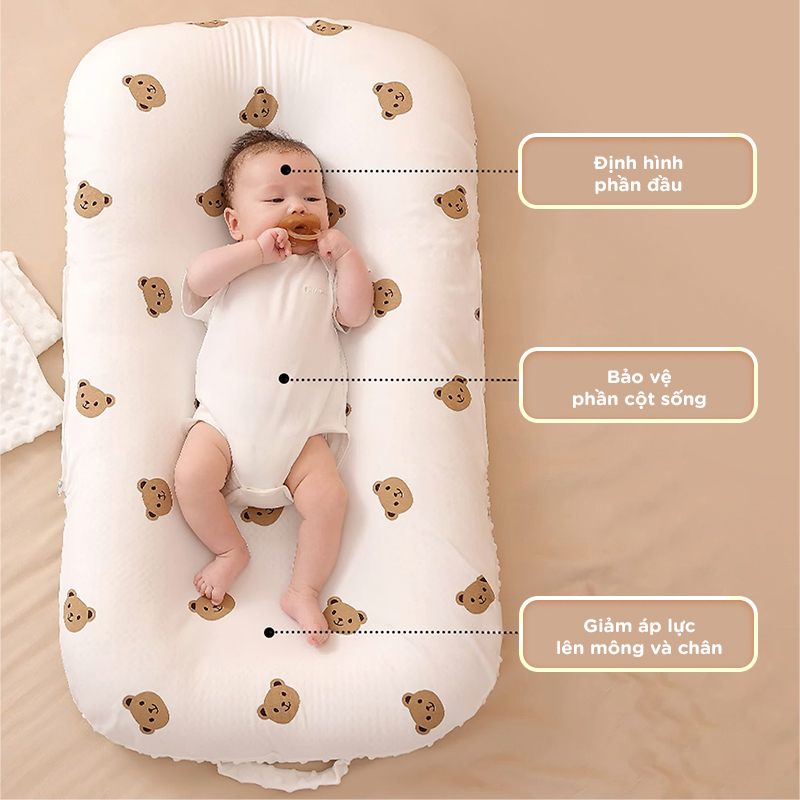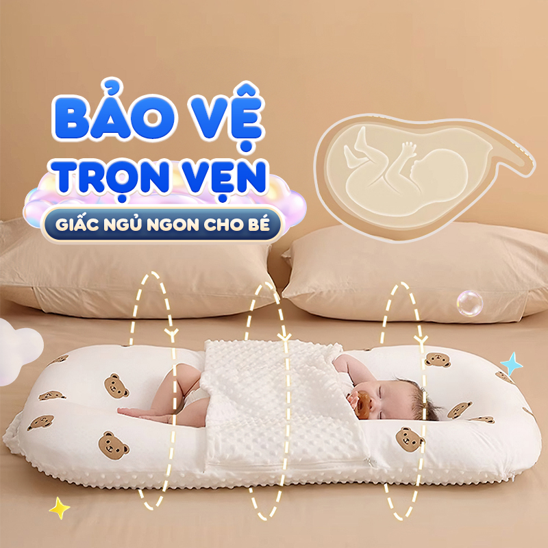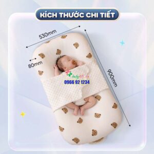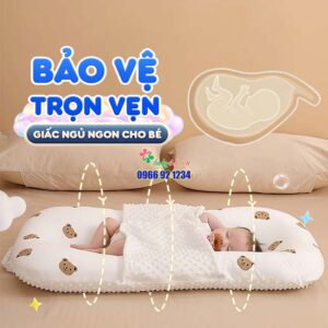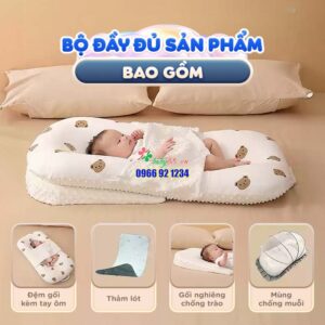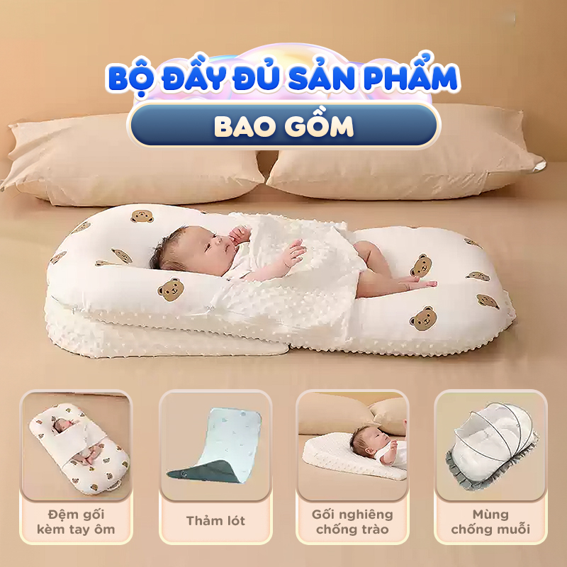 - Bộ sản phẩm bao gồm: Đệm gối kèm tay ôm; Thảm lót; Gối nghiêng chống trào; Mùng chống muỗi