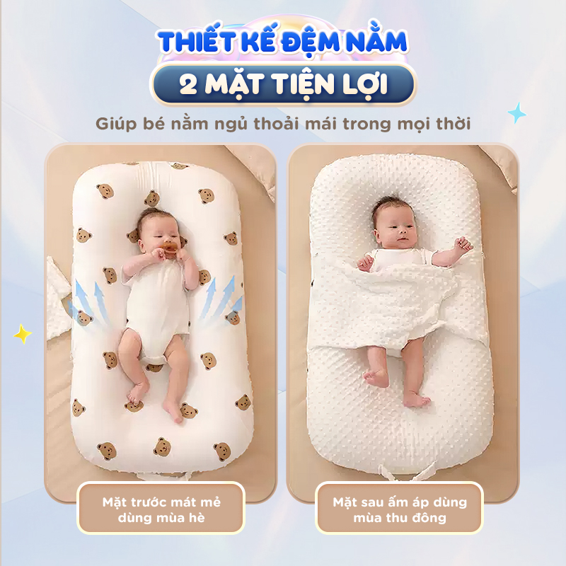 - Thiết kế đệm nằm 2 mặt: mặt trước mát mẻ dùng mùa hè, mặt sau ấm áp dùng mùa thu đông