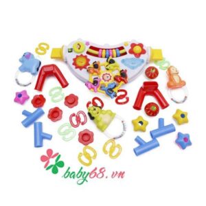 Mặt trên kệ có gắn nhiều con vật ngộ nghĩnh, hình mặt trời, đám mây, các vòng tròn nhiều màu sắc, có tác dụng kích thích thị giác và tạo hứng thú cho bé khi chơi.