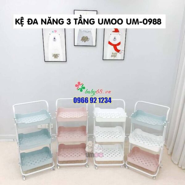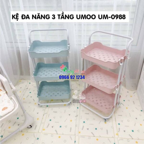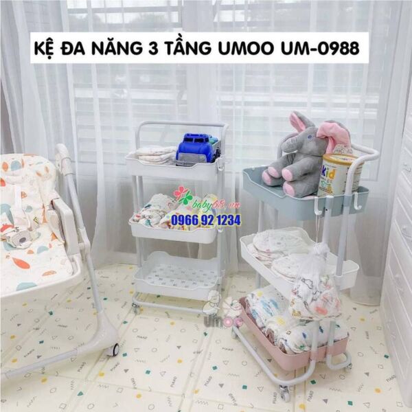 Kệ đa năng 3 tầng umoo UM-0988, kệ bỉm sữa, kệ sách, nhà bếp có bánh xe và tay cầm