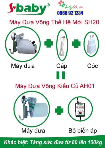 Đối với thế hệ máy đưa võng 2 phần (adapter, máy đưa) nếu 1 trong 2 bị hư thì máy không hoạt động được. Còn máy đưa võng SH20 nếu bị hỏng cóc sạc bạn có thể mua bất kỳ cóc sạc nào có cổng USB ở bất kỳ đâu là dùng được và với chi phí thấp hơn nhiều so với mua adapter của thế hệ trước đây.