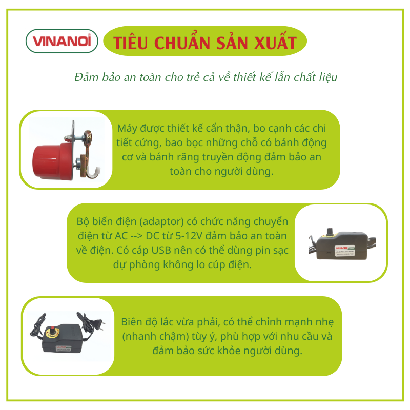 +Về thiết kế: Máy được thiết kế cẩn thận, bo cạnh các chi tiết cứng, bao bọc những chỗ có bánh động cơ và bánh răng truyền động đảm bảo an toàn cho người dùng. +Bộ biến điện (adaptor) có chức năng chuyển điện từ AC –> DC từ 5-12V đảm bảo an toàn về điện. + Biên độ lắc vừa phải, có thể chỉnh mạnh nhẹ (nhanh chậm) tùy ý, phù hợp với nhu cầu và đảm bảo sức khỏe người dùng. Tất cả làm nên chiếc Máy đưa võng tự động ASANTA đẹp, bền, an toàn cho bé yêu của bạn. |