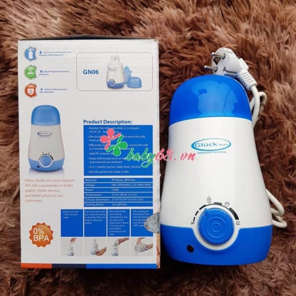 Máy hâm sữa đa năng Gluck GN06 bảo vệ hệ tiêu hóa, miễn dịch và cho bé những bữa ăn ngon miệng. Sản phẩm đa chức năng 3 trong 1 giúp hâm nóng, ủ ấm và tiệt trùng bình sữa, thức ăn. Máy hâm sữa đa năng chính hãng an toàn, dễ sử dụng, tiện mang đi mọi nơi. Hệ thống tự ngắt tiết kiệm điện và chống cháy nổ cho gia đình.
