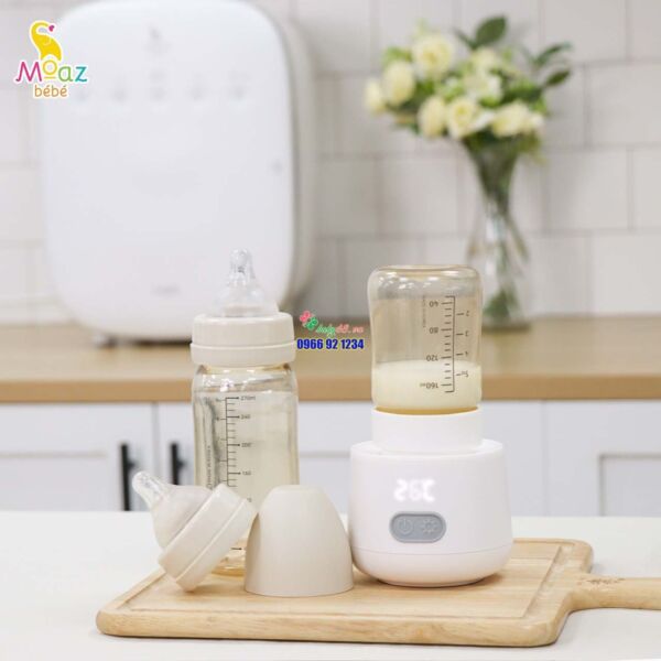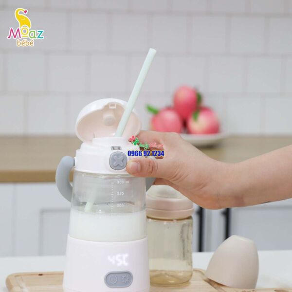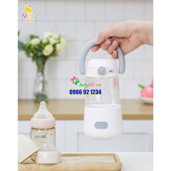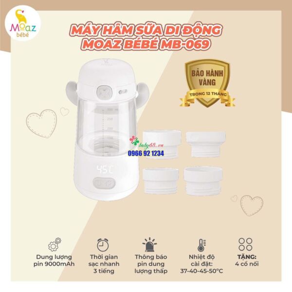 • Máy hâm sữa di động Moaz BéBé MB 069 giúp mẹ dễ dàng hâm nóng sữa cho bé mà không cần cắm điện trực tiếp. Sản phẩm thiết kế thông minh như một bình nước có thể xách tay tiện dụng. Mẹ sẽ có thể hâm sữa trực tiếp bằng bình sữa của bé nhờ 4 cổ nối tặng kèm hoặc hâm nước pha sữa nhờ bình thủy tinh của máy.