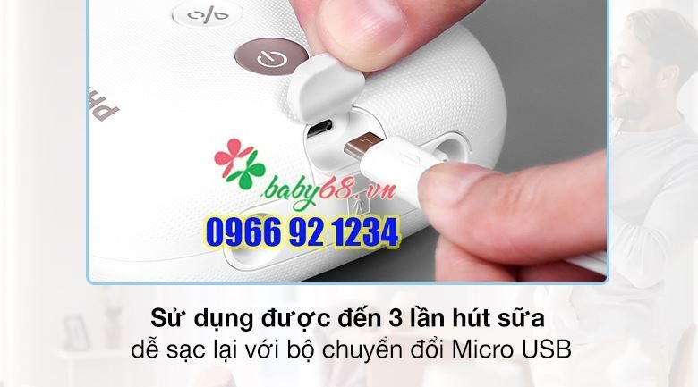 Hút sữa khi đang di chuyển mà không phải lo lắng về nguồn điện. Pin sạc đi kèm với bộ chuyển đổi micro-USB và sử dụng được đến 3 lần hút sữa chỉ với một lần sạc đầy pin.