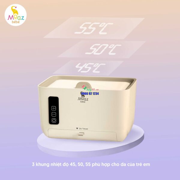 Máy làm ấm khăn ướt Moaz BéBé với thiết kế nhỏ gọn chất liệu an toàn, thân thiện. Với khả năng làm nóng khăn ướt hoặc khăn khô tiện lợi, giúp bố mẹ thuận tiện vệ sinh cho bé. Sản phẩm có thể lựa chọn 3 mức nhiệt độ 45, 50, 55 độ C và có khay hâm nóng riêng biệt cho khăn ướt, khăn khô cho bé sử dụng.