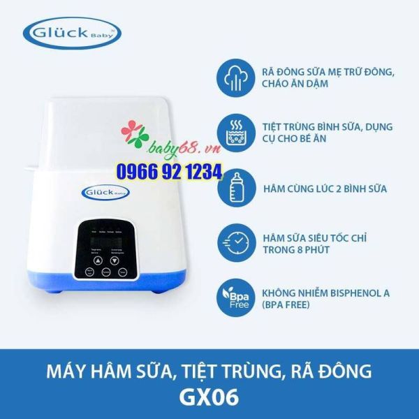 Máy tiệt trùng bình sữa, hâm nóng và rã đông Gluck GX06 với chất liệu nhựa cao cấp, an toàn, không chứa BPA. Ngoài chế độ tiệt trùng bằng hơi nước chỉ trong 8 phút, đảm bảo bình sữa núm ti của bé được sạch vi khuẩn, tránh các bệnh về tiêu hóa khi mẹ pha sữa cho trẻ. Ngoài ra, máy còn có chế độ hâm sữa độc lập, tiết kiệmvà cực kỳ tiện dụng cho gia đình có con nhỏ.