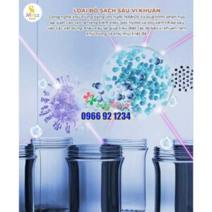 Công nghệ khử trùng bằng ion nước nanoe: Là quá trình phân hủy áp suất cao tạo ra hàng trăm triệu gốc hydro và oxy xâm nhập vào lớp sâu của các vật dụng. Tìm thấy vi khuẩn, protein tế bào vi khuẩn bị phân hủy…sau đó khử trùng và khử mùi triệt để.
