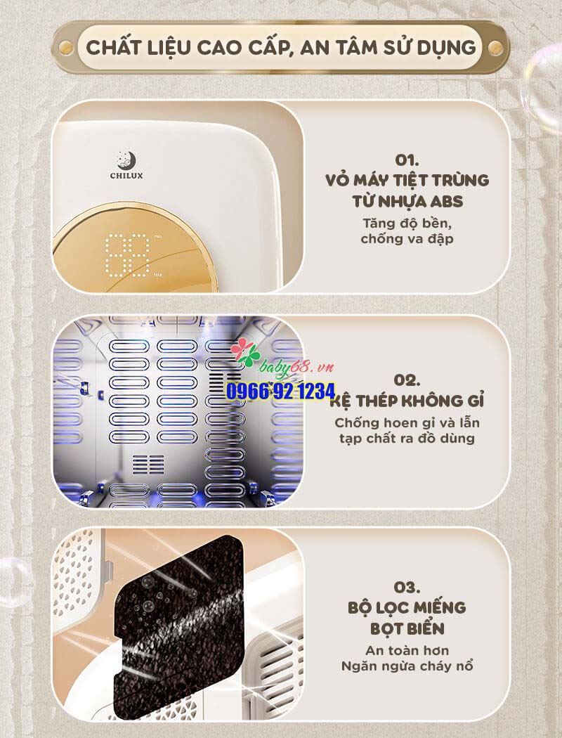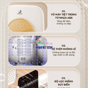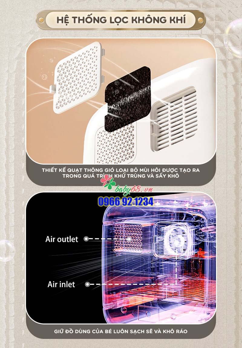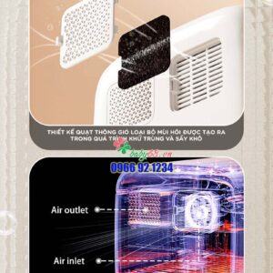 - Thiết kế quạt thông gió lọc không khí, loại bỏ mùi hôi trong quá trình tiệt trùng và sấy khô
