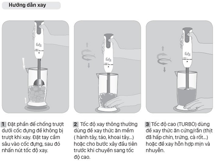 Hai tốc độ xay để thực hiện xay các loại nguyên vật liệu khác nhau với mục đích khác nhau. (TURBO là nút xay tốc độ cao).