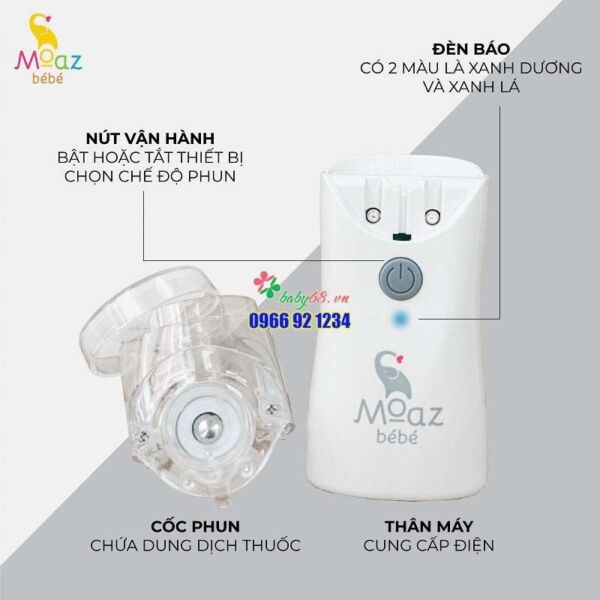 Máy xông khí dung Moaz BéBé gọi tắt là máy xông hoặc thiết bị xông. Thiết bị vật lý này được thiết kế để điều trị bệnh hô hấp và phòng ngừa nhiễm trùng đường hô hấp. Máy xông khí dung Moaz BéBé có công dụng sục khí các dung dịch theo đơn thuốc của bác sĩ qua đường hít thở, được phê duyệt để sử dụng với một máy xông khí dung đa năng.