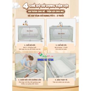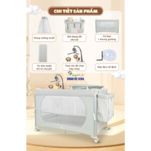 Tiện ích: Mở và đóng nôi với 1 nút bấm; Ghép đôi với giường lớn; Gấp gọn gọn nhẹ, dễ mang theo; Nôi có 2 chế độ: tầng dưới làm sân chơi, tầng trên làm nôi ngủ; Kệ thay tã cao cấp và kệ đựng đồ 3 tầng, màn ngăn muỗi, thanh đồ chơi
