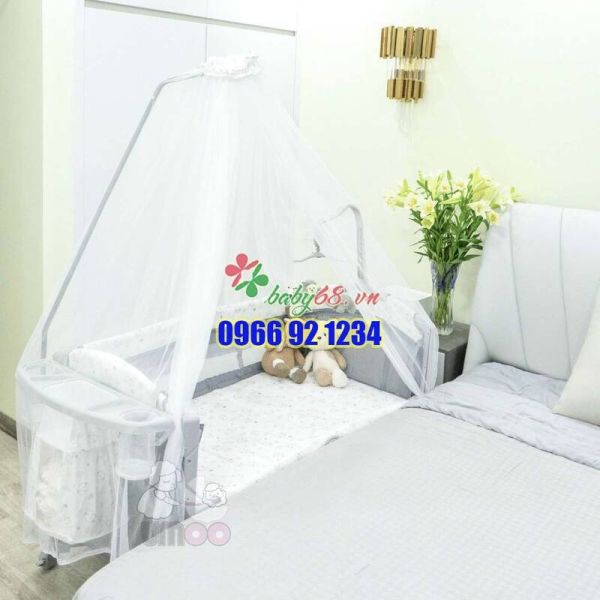 + Hạ thành nôi 4 cấp kê cạnh giường của mẹ để mẹ dễ chăm sóc bé ban đêm ( có khoá và dây an toàn giữ chặt nôi chống trôi )